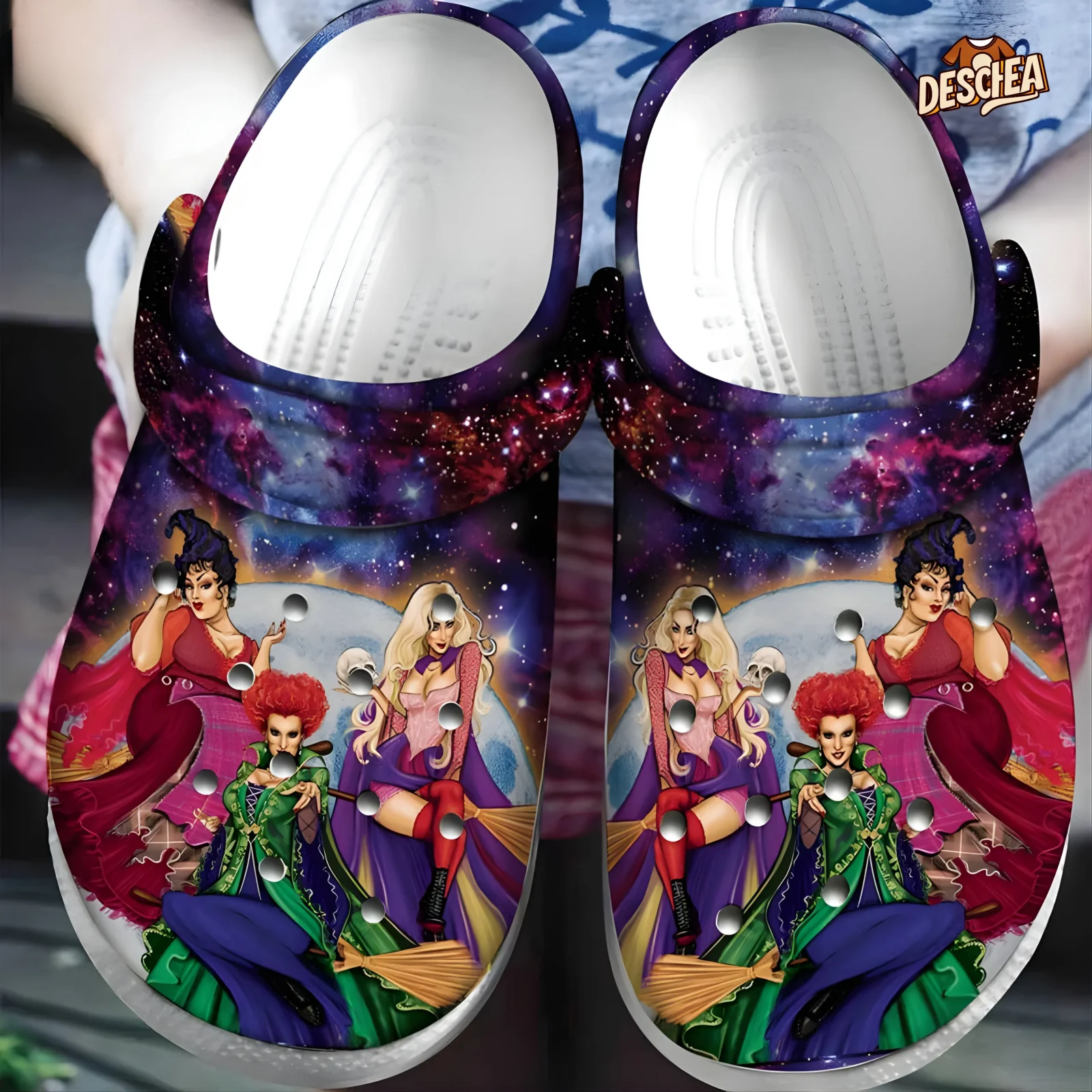 Hocus Pocus Sanderson Sisters Flying On Bloom With Galaxy Background Halloween Crocs